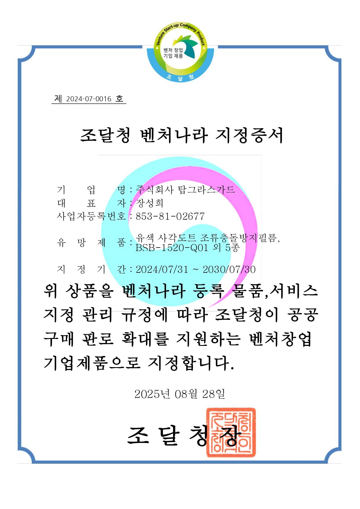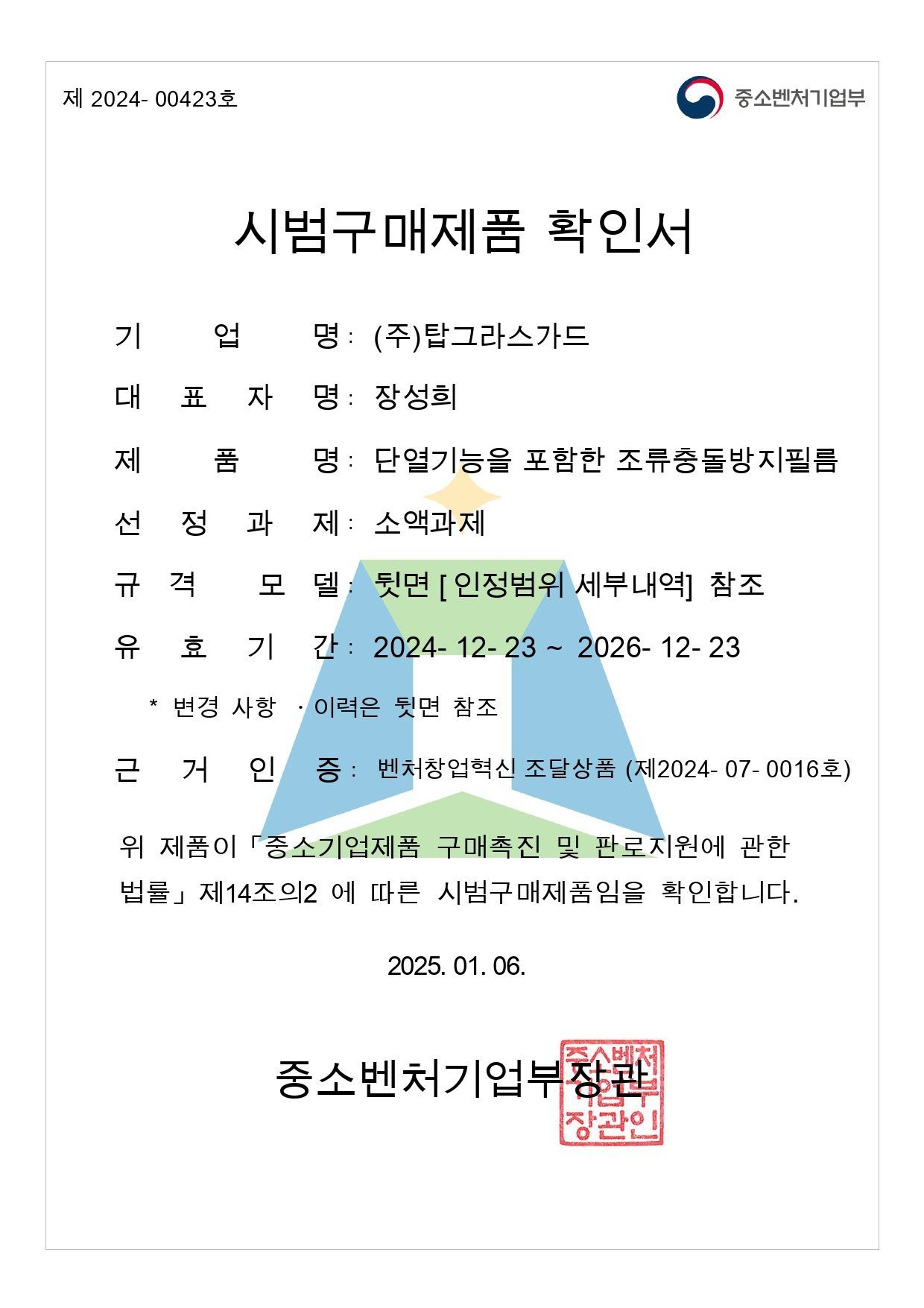 - 30년 전통의 탑그라스가드 윈도우 필름에서 개발한 조류충돌저감 방안의 핵심 조류충돌방지필름을 제조, 공급, 시공까지 All in One 원스탑 제공하고 있습니다.