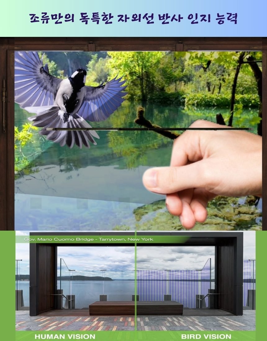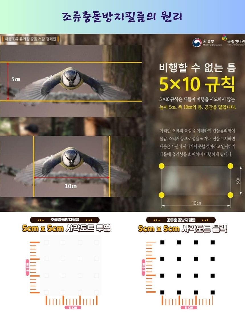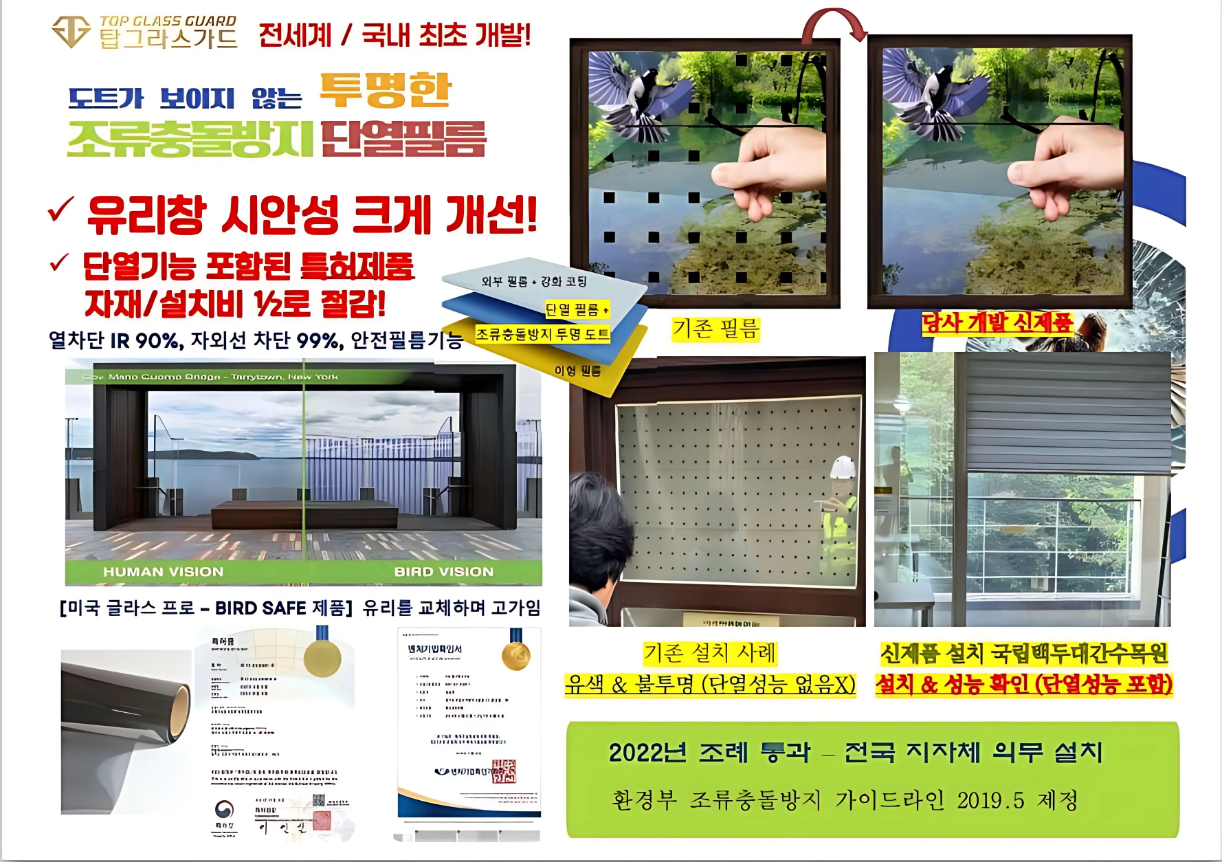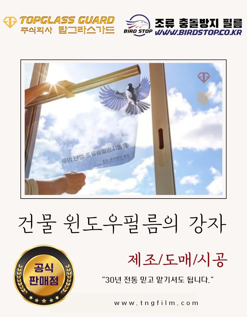 새(조류)가 유리창에 충돌하여 즉사하는 끔찍한 사고는 트라우마를 낳게 합니다. 조류충돌방지필름으로 새들을 미리 피하게 만들면 이러한 충돌 사고를 없앨 수 있습니다. 4밀두께의 필름으로 유리강화 효과까지 덤으로! 얻어가세요. 새도 살리고 나도 사는 조류충돌방지필름 설치! 우리 모두가 해피해지는 유일한 방법입니다! 버드세이버(새모양 필름)와 조류충돌방지테이프는 여러가지 문제가 많아 현실적으로 가장 완벽한 조류충돌방지필름 설치가 최선의 답임을 명심하세요!